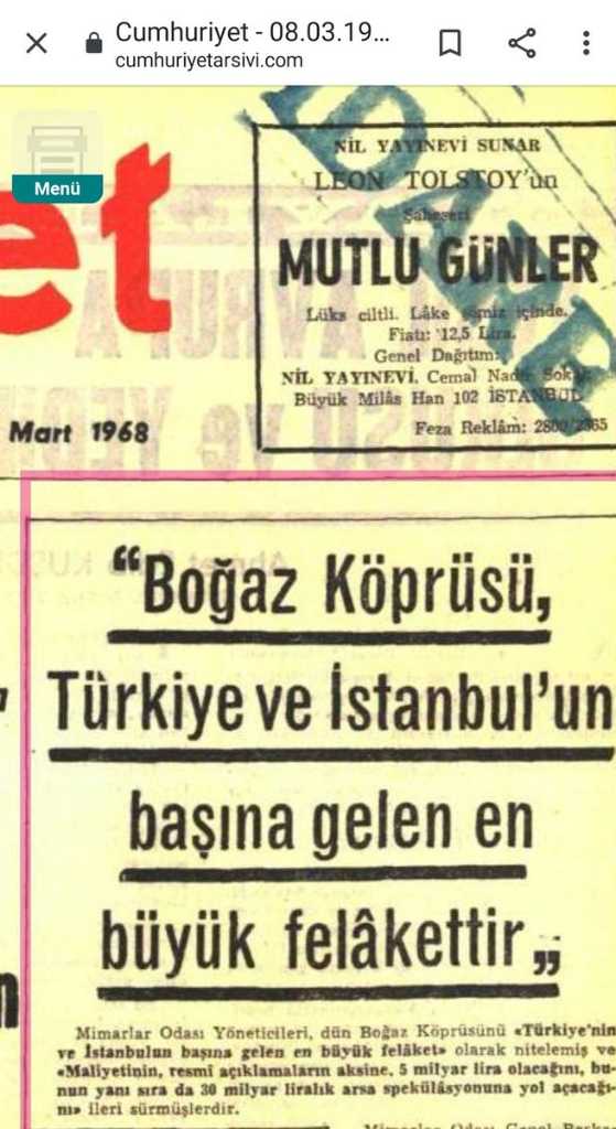 Dönemin önemli başyazarı... Nadir Nadi... "Birinci Köprü" için... Aynen şunları yazmıştı: - Bu köprü, sağcıların köprüsüdür... Boğaziçi Köprüsü, kel başa şimşir taraktır. Yavuz Donat ( https://x.com/Mbirpinar/status/1505090966679654401)